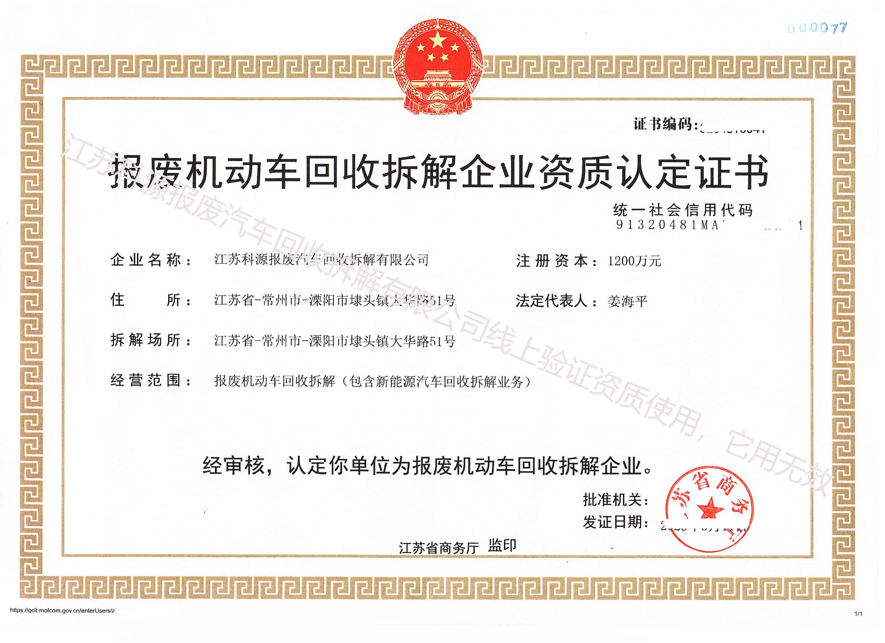 江苏U源报废汽R回收拆解有限公司报废机动车回收拆解企业资质认定证?/span>